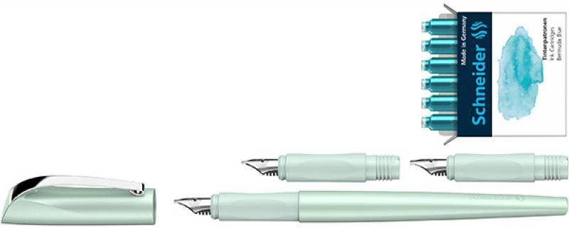 zawartość zestawu: Pióro wieczne do kaligrafii o grubości linii pisania 1,1 mm, dwie zapasowe końcówki o grubości 1,5 mm i 1,8 mm oraz 6 x naboje atramentowe "Bermuda Blue"