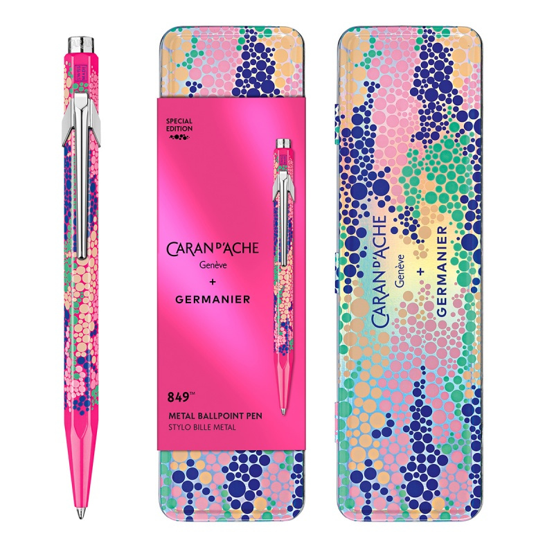 Kultowy długopis 849 Germanier inspirowany perłami projektanta. Posiada sześciokątny aluminiowy korpus, który jest lekki i trwały. Neonowo różowy lakierowany korpus z czterokolorowym perłowym wzorem. Podpis GERMANIER na przedniej stronie klipsa.