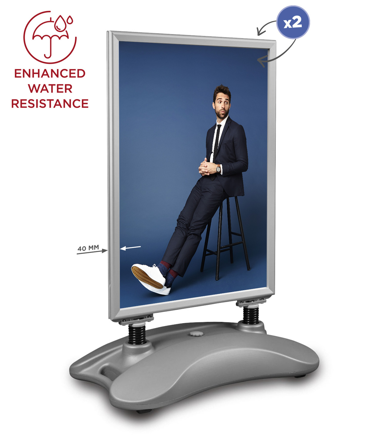<h2 style="text-align: justify;">Ulepszona wersja potykacza Hampton. Dodatkowe uszczelki oraz grubsza os³ona na plakat jeszcze bardziej zwiêkszaj¹ wytrzyma³oæ produktu na warunki atmosferyczne. <br />Dziêki szerokiej aluminiowej ramie (40 mm) osadzonej na sprê¿ynach, system dostosowuje siê do si³y wiatru. Po wype³nieniu podstawy wod¹ potykacz staje siê bardzo ciê¿kim i jeszcze bardziej stabilnym systemem reklamowym. <br />Wymiana grafiki dziêki ramce OWZ zajmuje dos³ownie chwilê. Specjalna r¹czka i kó³ka u³atwiaj¹ z kolei przemieszczenie ca³ego systemu.</h2> <p><strong>ZALETY PRODUKTU: </strong></p> <ul> <li>- profil aluminiowy - 40 mm</li> <li>- zwiêkszona wytrzyma³oæ na warunki atmosferyczne</li> <li>- wyj¹tkowo stabilny nawet przy silnym wietrze</li> <li>- specjalna r¹czka i kó³ka u³atwiaj¹ce przemieszczanie systemu</li> <li>- szybka wymiana grafiki (ramka OWZ)</li> <li>- gruba os³ona na plakat z filtrem UV</li> </ul> <div> <table border="0"> <tbody> <tr> <td> <p>Instrukcja monta¿u (pdf) </p> </td> <td><a href="/files/file/Potykacze_inne/Hampton/HAMPTON-assembly.jpg"><img src="/files/image/123.jpg" alt="" width="45" height="58" /></a></td> </tr> </tbody> </table> </div> <div> <p><span>- profil ramki: 40 mm<br /></span><span>- pojemnoæ podstawy: 23 l</span></p> <div><span>Zestaw zawiera: potykacz Hampton PRO zapakowany w 2 kartony. </span></div> </div>