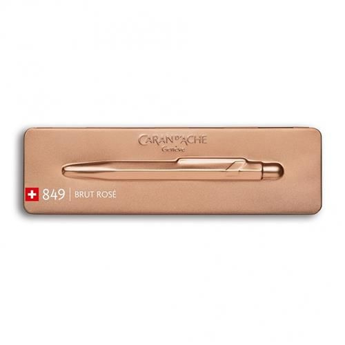 Długopis szwajcarskiej marki Caran d’Ache z kolekcji 849 Brut Rose. Aby uzyskać kolor różowego złota i satynową powierzchnię długopis przechodzi kilka skomplikowanych procesów technologicznych. Jest odzwierciedleniem zmieniających się trendów. Długopis wykonany z aluminium o sześciokątnym przekroju, idealnie dopasowany do dłoni. Posiada przyciskowy mechanizm wysuwu wkładu i bardzo solidny klips. Wyposażony w bardzo pojemny wkład długopisowy Goliath, który pozwoli nam na zapisanie 600 stron A4. Długopis umieszczony jest w specjalnym firmowym pudełku z magnetycznym zamknięciem. Wyprodukowany w Szwajcarii.