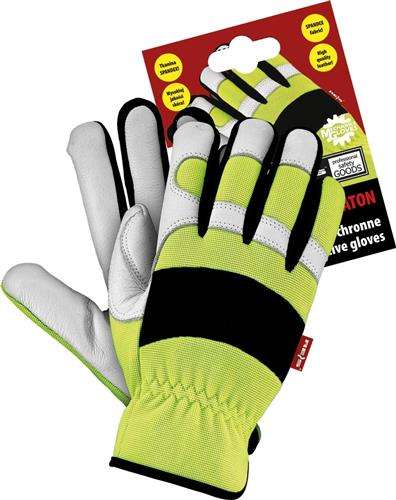 Rękawice ochronne wykonane z wysokiej jakości skóry bydlęcej połączonej z materiałem.