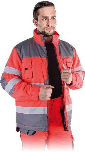 - na ramionach, łokciach i w dolnych partiach kurtki wzmocnienie z szarego materiału, co zwiększa wytrzymałość kurtki na przetarcia
