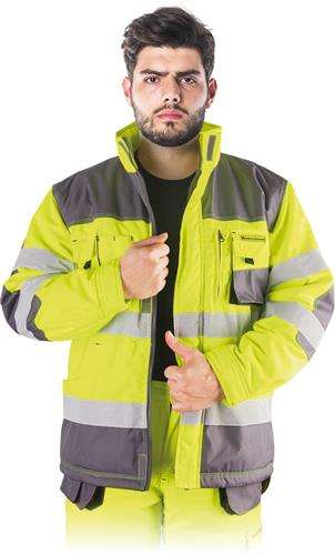 - na ramionach, łokciach i w dolnych partiach kurtki wzmocnienie z szarego materiału, co zwiększa wytrzymałość kurtki na przetarcia