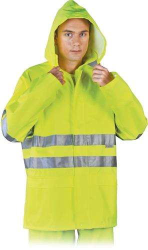 Kurtka przeciwdeszczowa z pasami odblaskowymi.